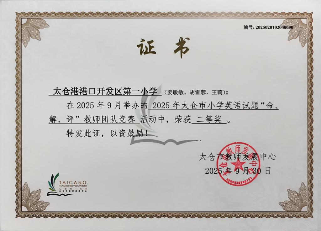 2025.09 港区一小在2025年太仓市小学英语试题“命解评”教师团队竞赛中获二等奖