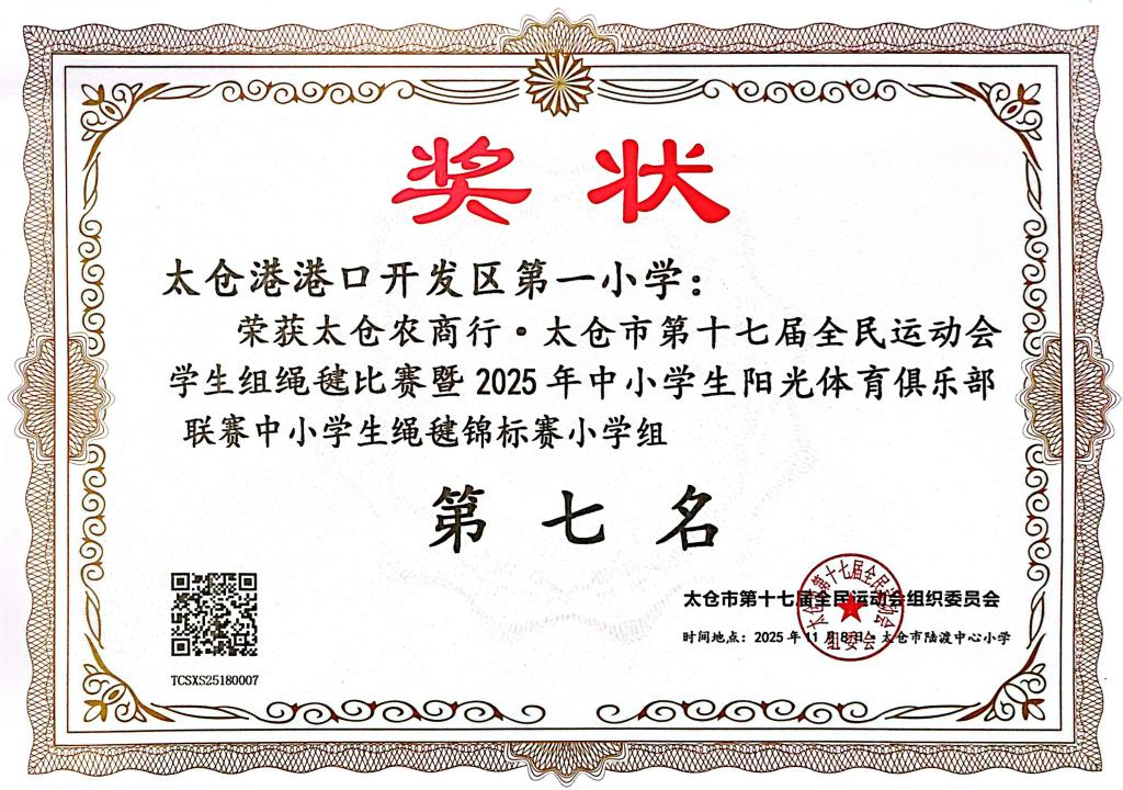 2025.11 港区一小获太仓市第十七届全民运动会学生组绳毽比赛小学组第七名