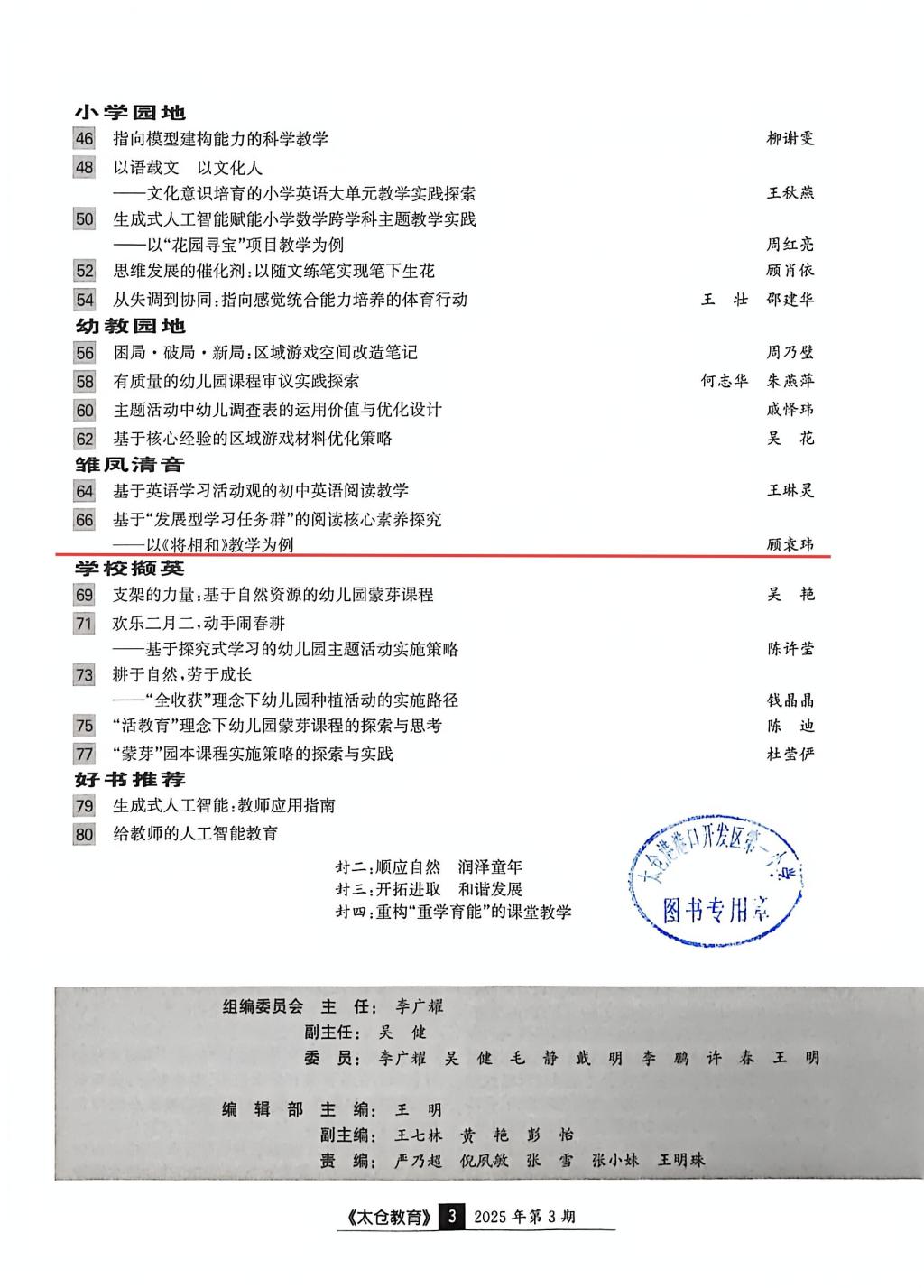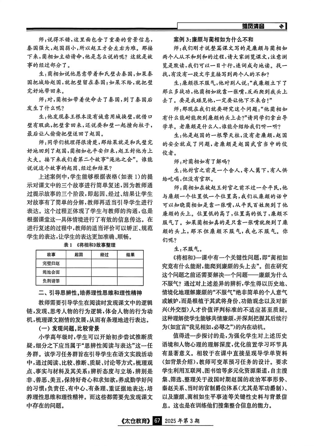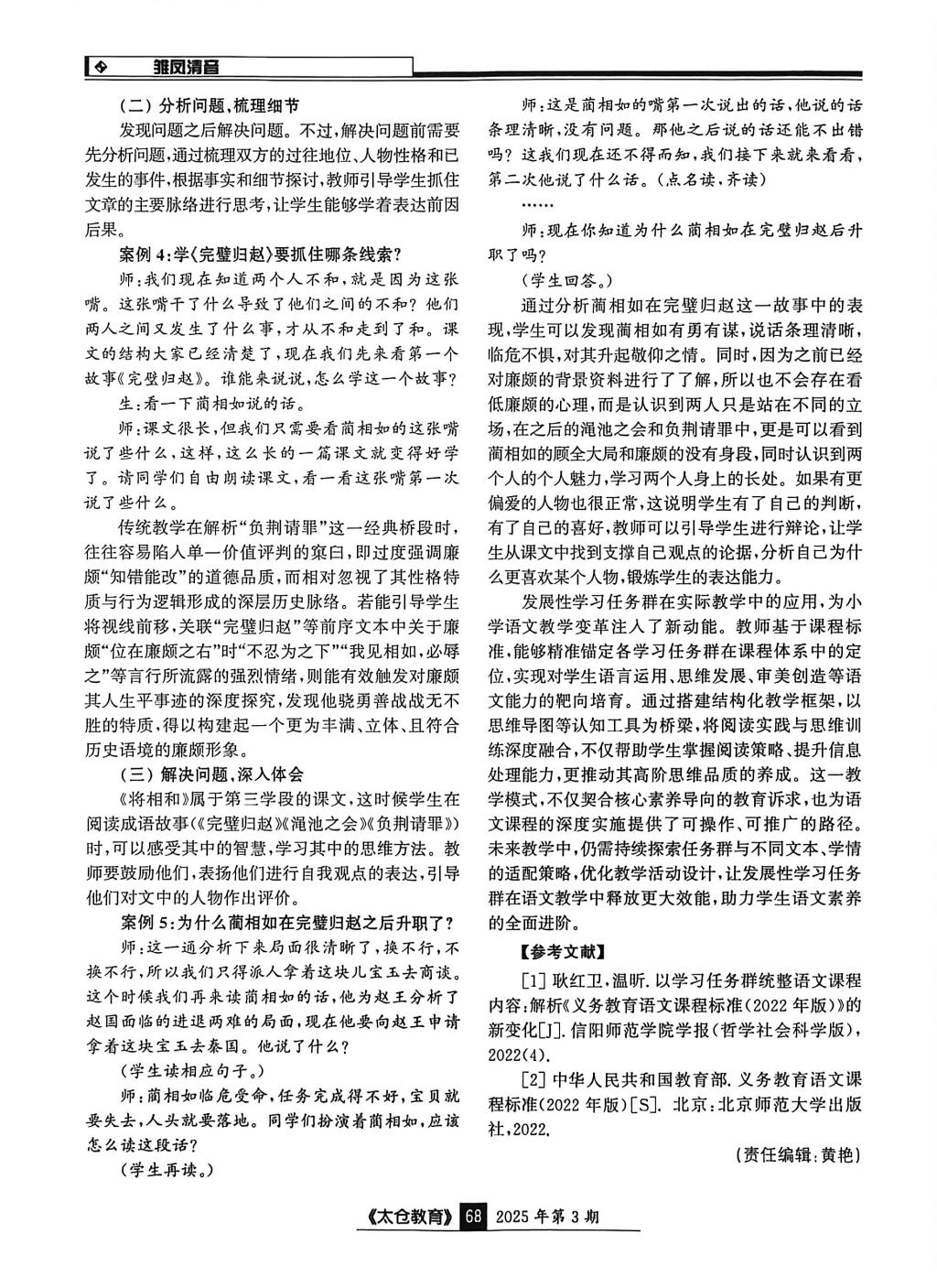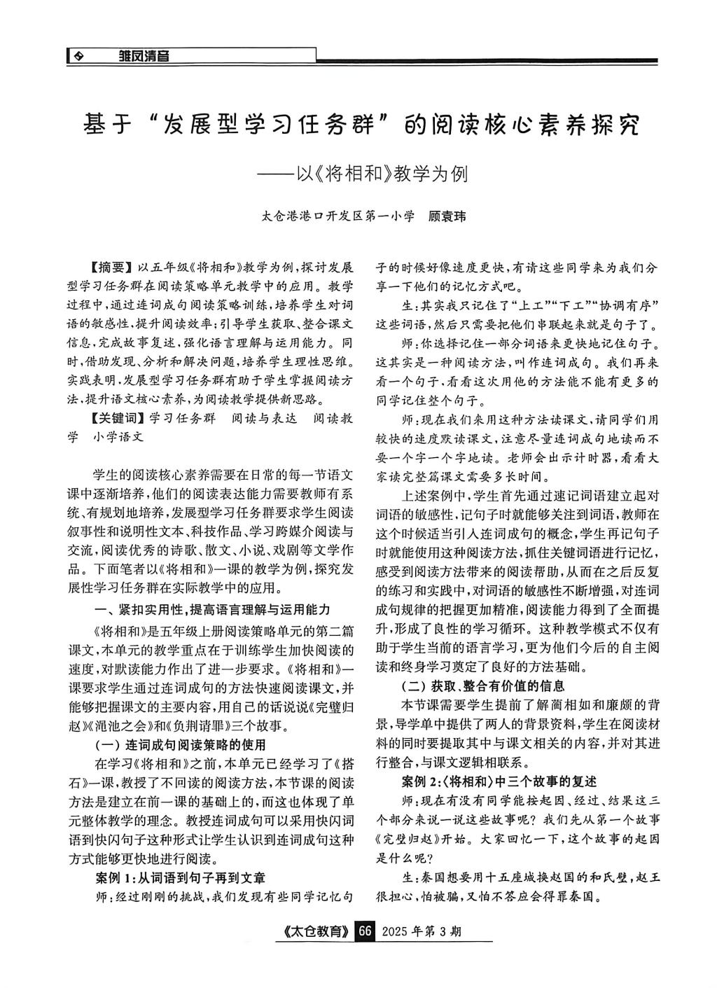 顾袁玮的《基于“发展型学习任务群”的阅读核心素养探究——以<将相和>教学为例》发表于《太仓教育》2025年第3期