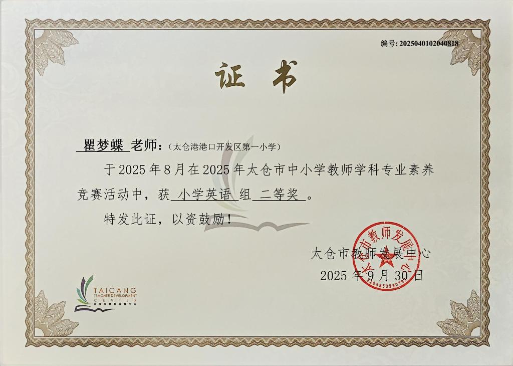 2025.9 瞿梦蝶在2025年太仓市中小学教师学科专业素养竞赛中获小学英语组二等奖