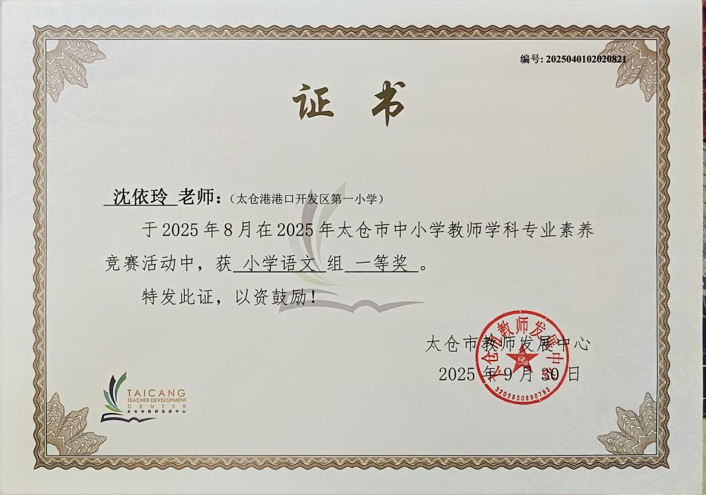2025.9 沈依玲在2025年太仓市中小学教师学科专业素养竞赛中获小学语文组一等奖