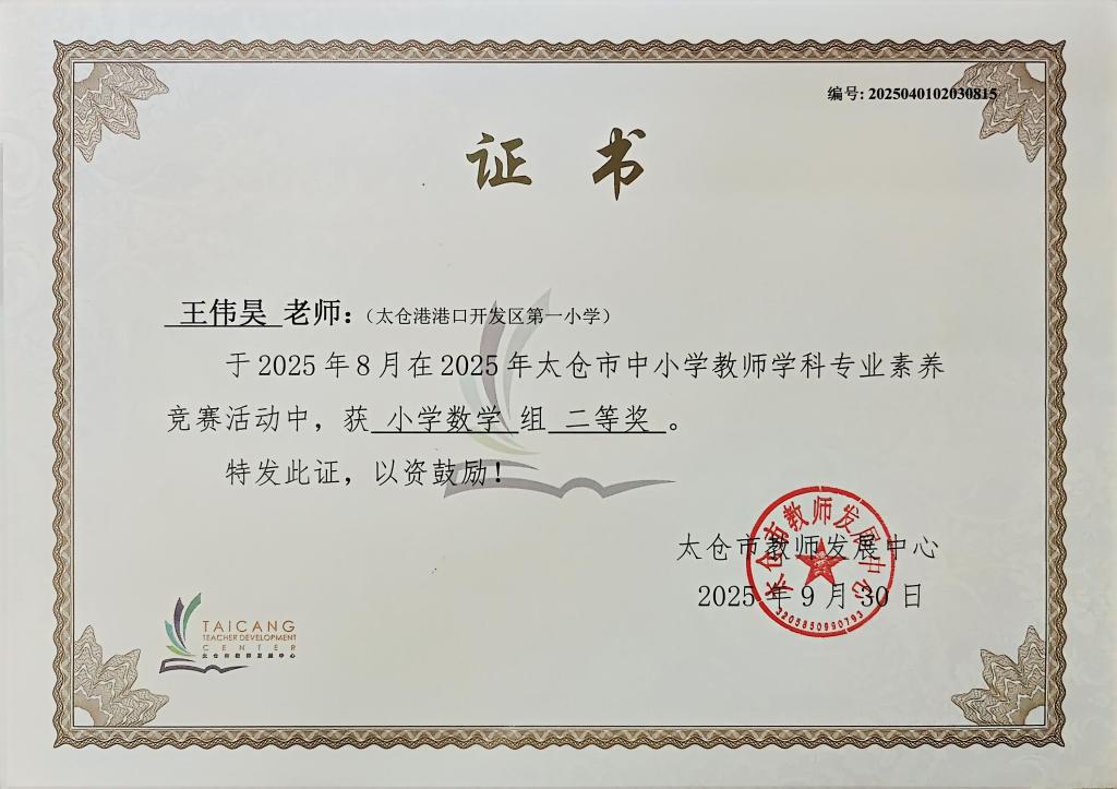 2025.9 王伟昊在2025年太仓市中小学教师学科专业素养竞赛中获小学数学组二等奖