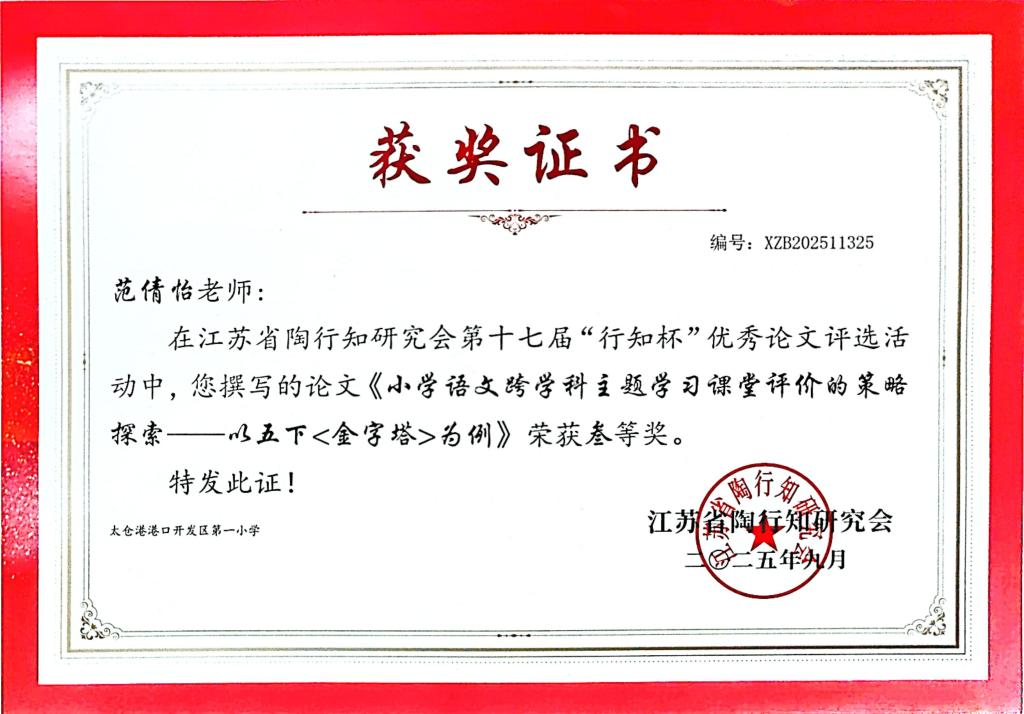 2025.9 范倩怡的《小学语文跨学科主题学习课堂评价的策略探索》获第十七届“行知杯”论文评比三等奖