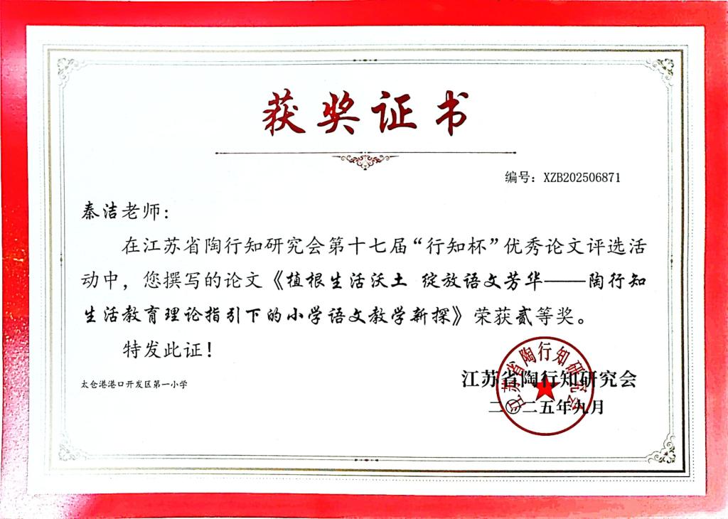 2025.9 秦洁的《植根生活沃土 绽放语文芳华》获第十七届“行知杯”论文评比二等奖