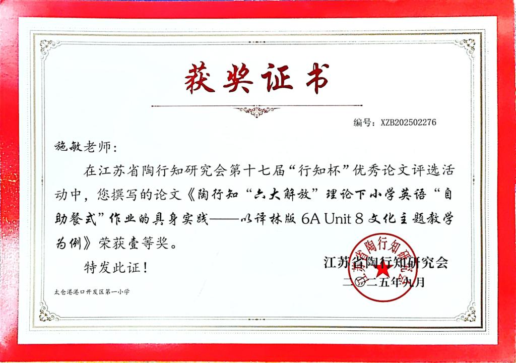 2025.9 施敏的《陶行知“六大解放“理论下小学英语“自助餐式”作业的具身实践》获第十七届“行知杯”论文评比一等奖
