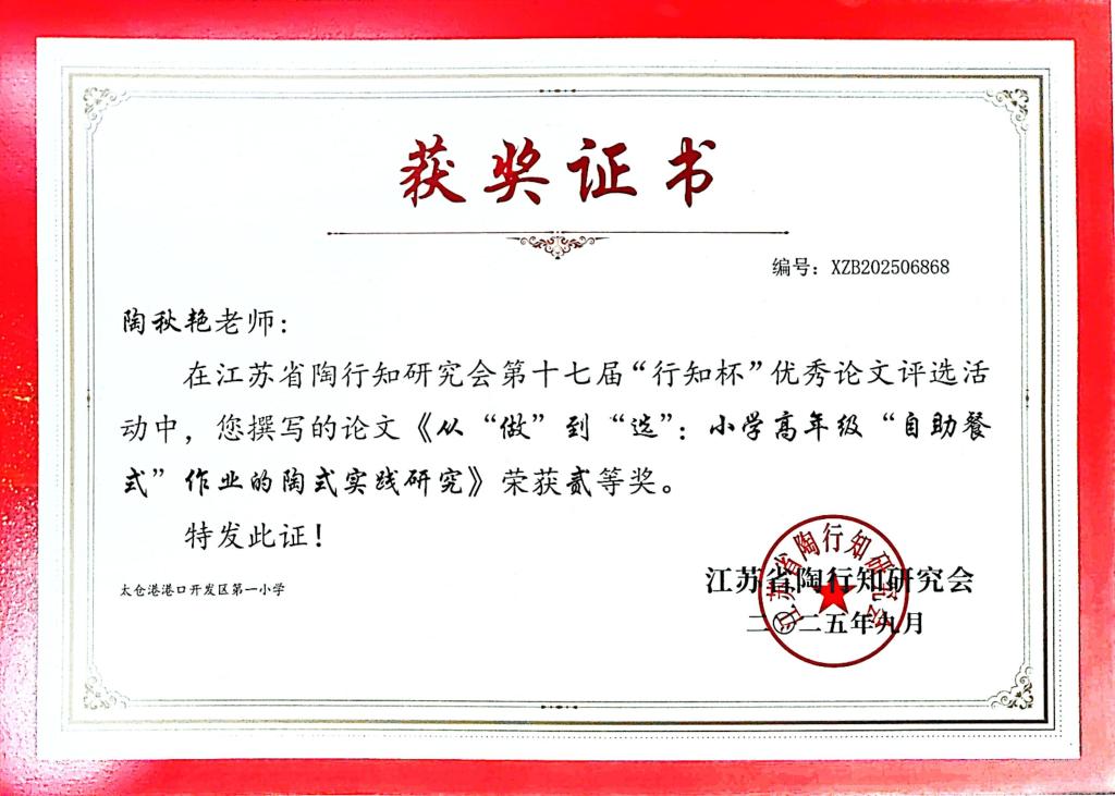 2025.9 陶秋艳的《从“做”到“选”:小学高年级“自助餐式”作业的陶式实践研究》获第十七届“行知杯”论文评比二等奖