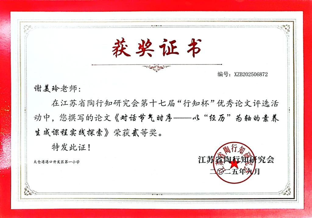 2025.9 谢美玲的《对话节气时序——以“经历”为轴的素养生成课程实践探索》获第十七届“行知杯”论文评比二等奖
