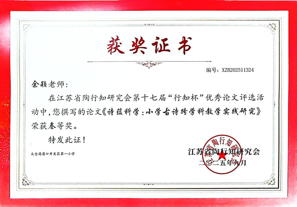 2025.9 余颖的《诗韵科学:小学古诗跨学科教学实践研究》获第十七届“行知杯”论文评比三等奖