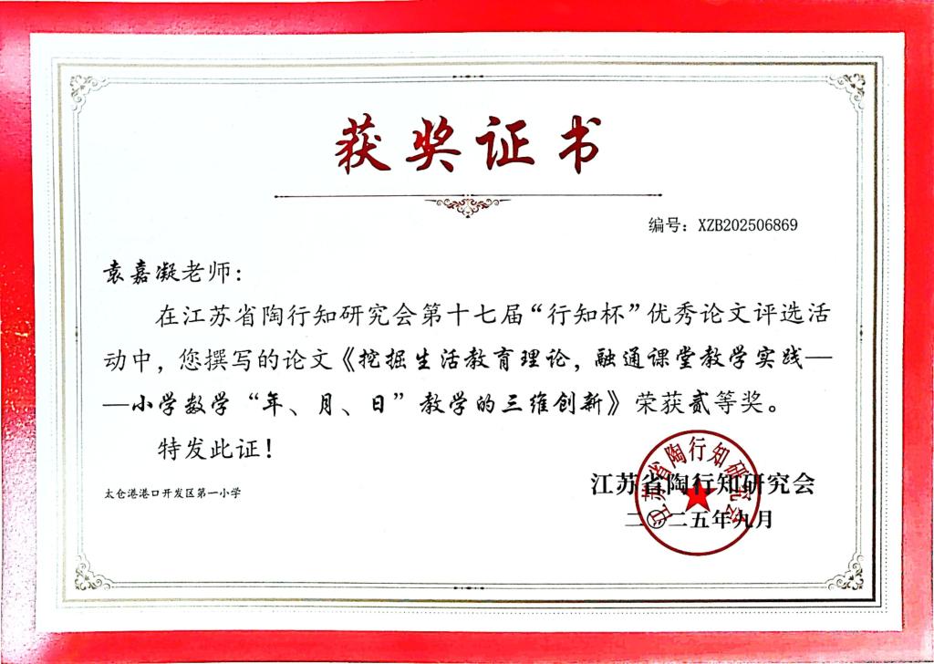 2025.9 袁嘉凝的《挖掘生活教育理论,融通课堂教学实践》获第十七届“行知杯”论文评比二等奖