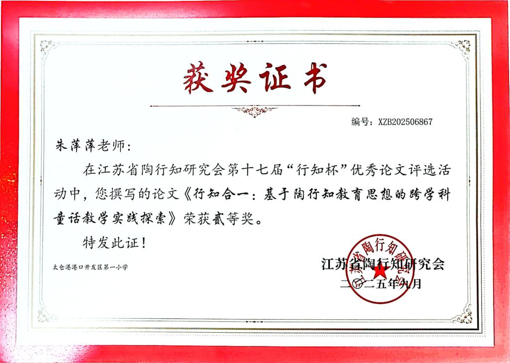 2025.9 朱萍萍的《知行合一:基于陶行知教育思想的跨学科童话教学实践探索》获第十七届“行知杯”论文评比二等奖