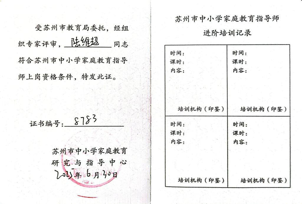 2025.6 陆维超获得苏州市中小学家庭教育指导师资格证