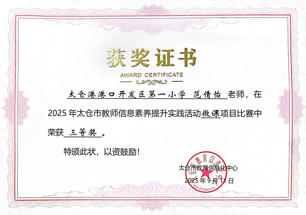 2025.9 范倩怡获2025太仓市教师信息素养提升实践活动微课项目比赛三等奖
