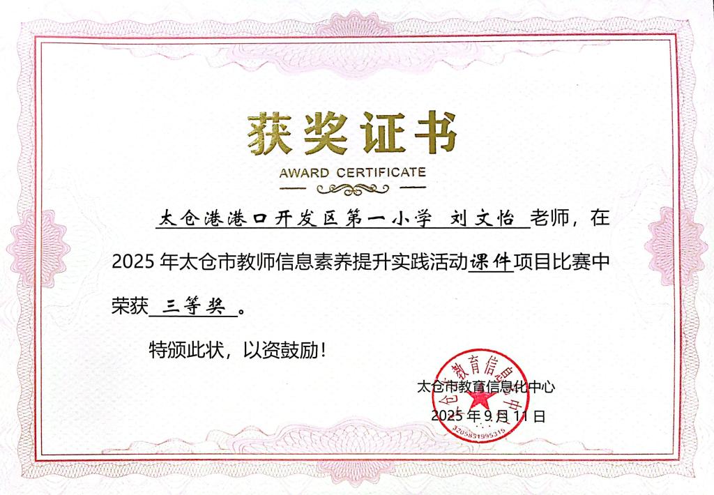 2025.9 刘文怡获2025太仓市教师信息素养提升实践活动课件项目比赛三等奖