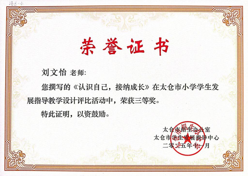 2025.11 刘文怡的《认识自己,接纳成长》获太仓市小学生发展指导教学设计评比三等奖