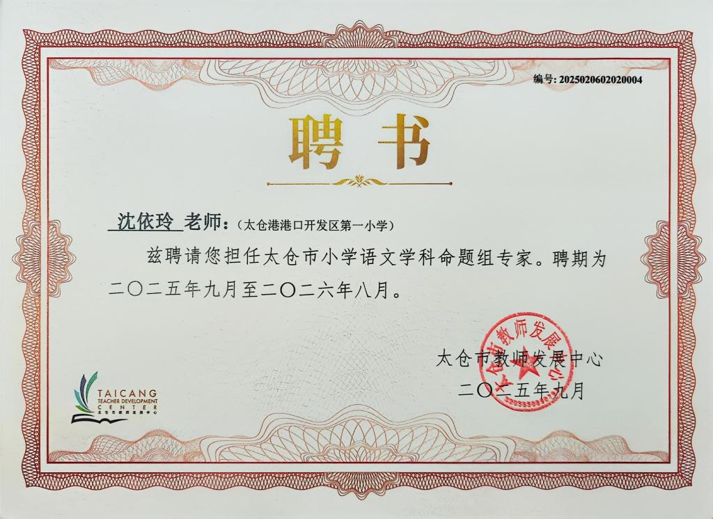 2025.9 沈依玲被聘为太仓市小学语文学科命题组专家聘期(2025.9-2026.8)