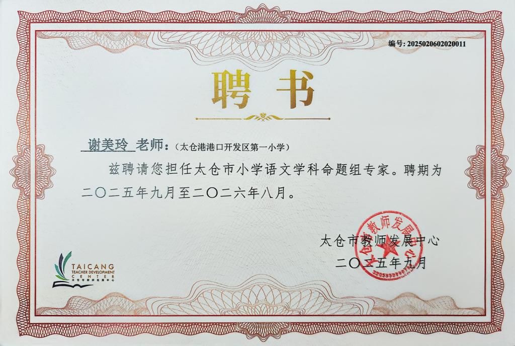 2025.9 谢美玲被聘为太仓市小学语文学科命题组专家(聘期2025.9-2026.8)
