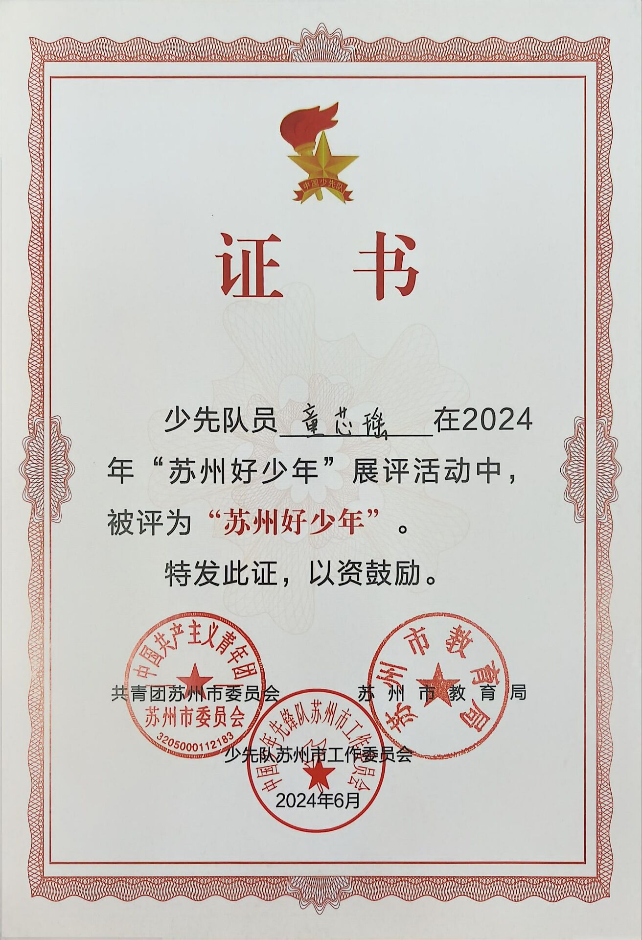 2024.6 童芯瑶被评为2024年“苏州好少年”
