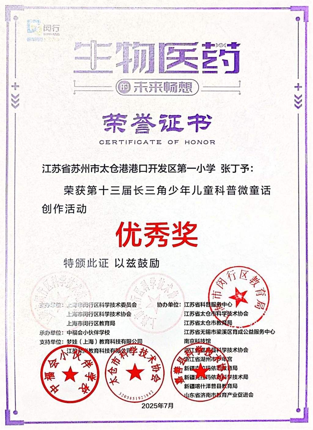 2025.7 张丁予获第十三届长三角少年儿童科普微童话创作优秀奖