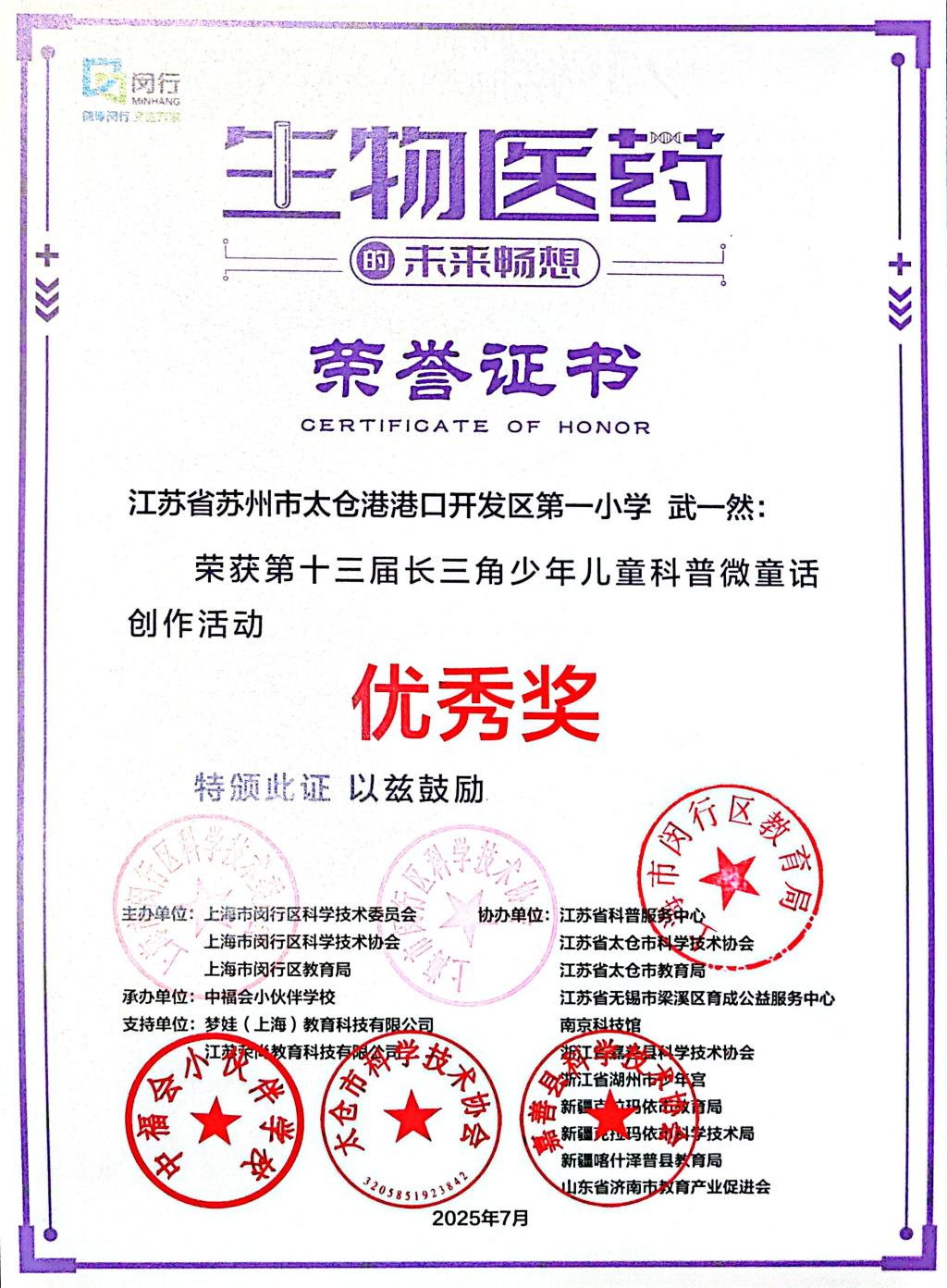 2025.7 武一然获第十三届长三角少年儿童科普微童话创作优秀奖
