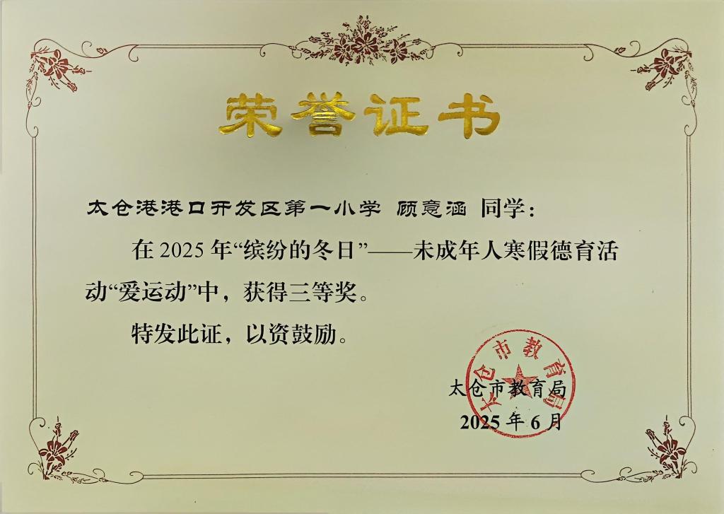 2025.6 顾意涵在2025年“缤纷的冬日”寒假德育活动“爱运动”中获三等奖