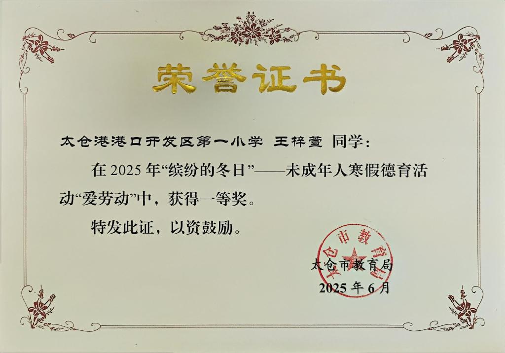 2025.6 王梓萱在2025年“缤纷的冬日”寒假德育活动“爱劳动”中获一等奖
