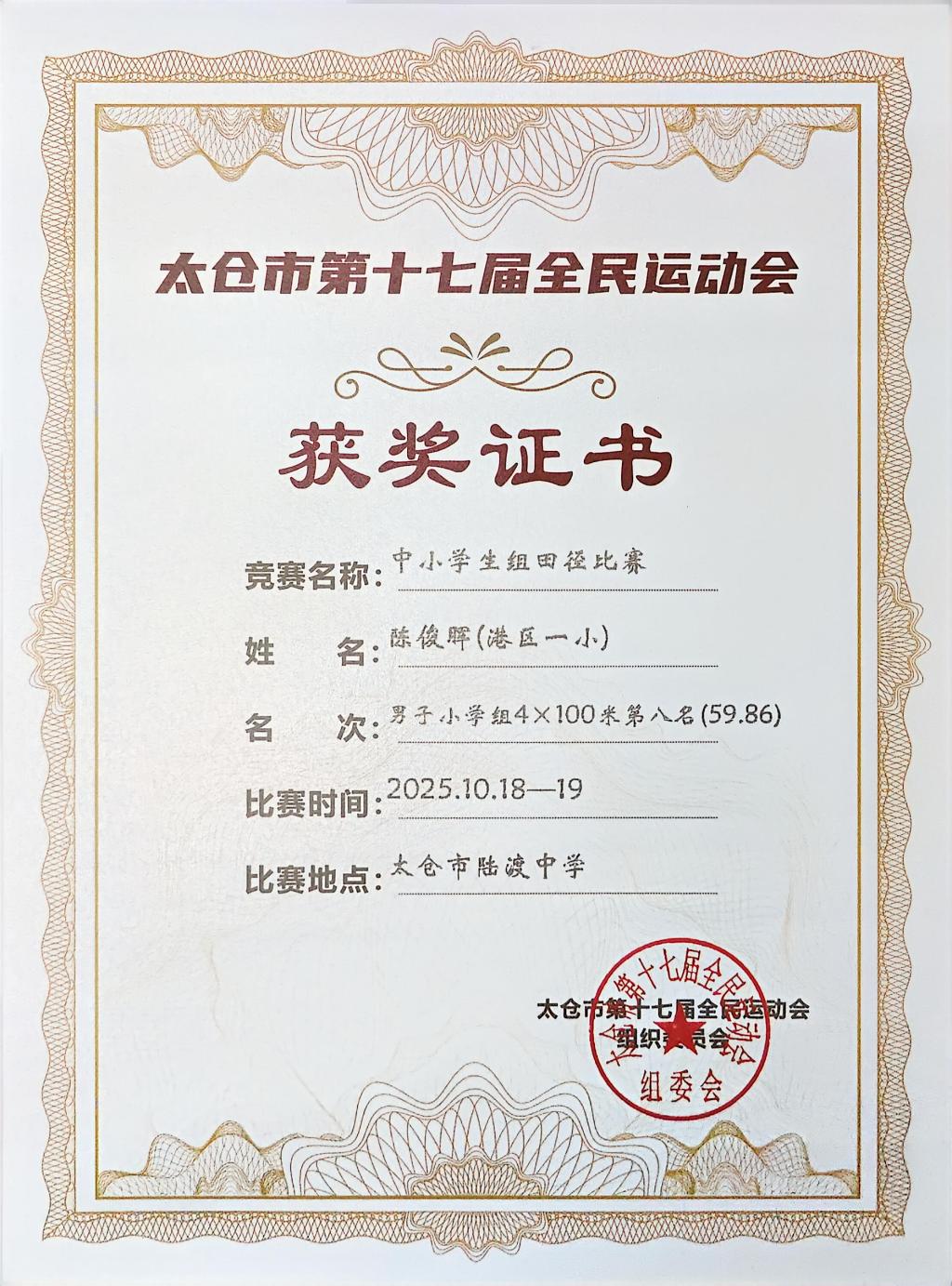 2025.10 陈俊晖在太仓市中小学生田径比赛中获小学男子4x100米第八名