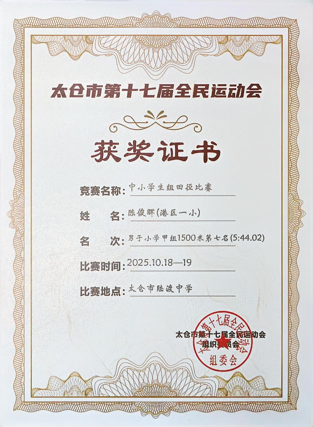 2025.10 陈俊晖在太仓市中小学生田径比赛中获小学男子1500米第七名