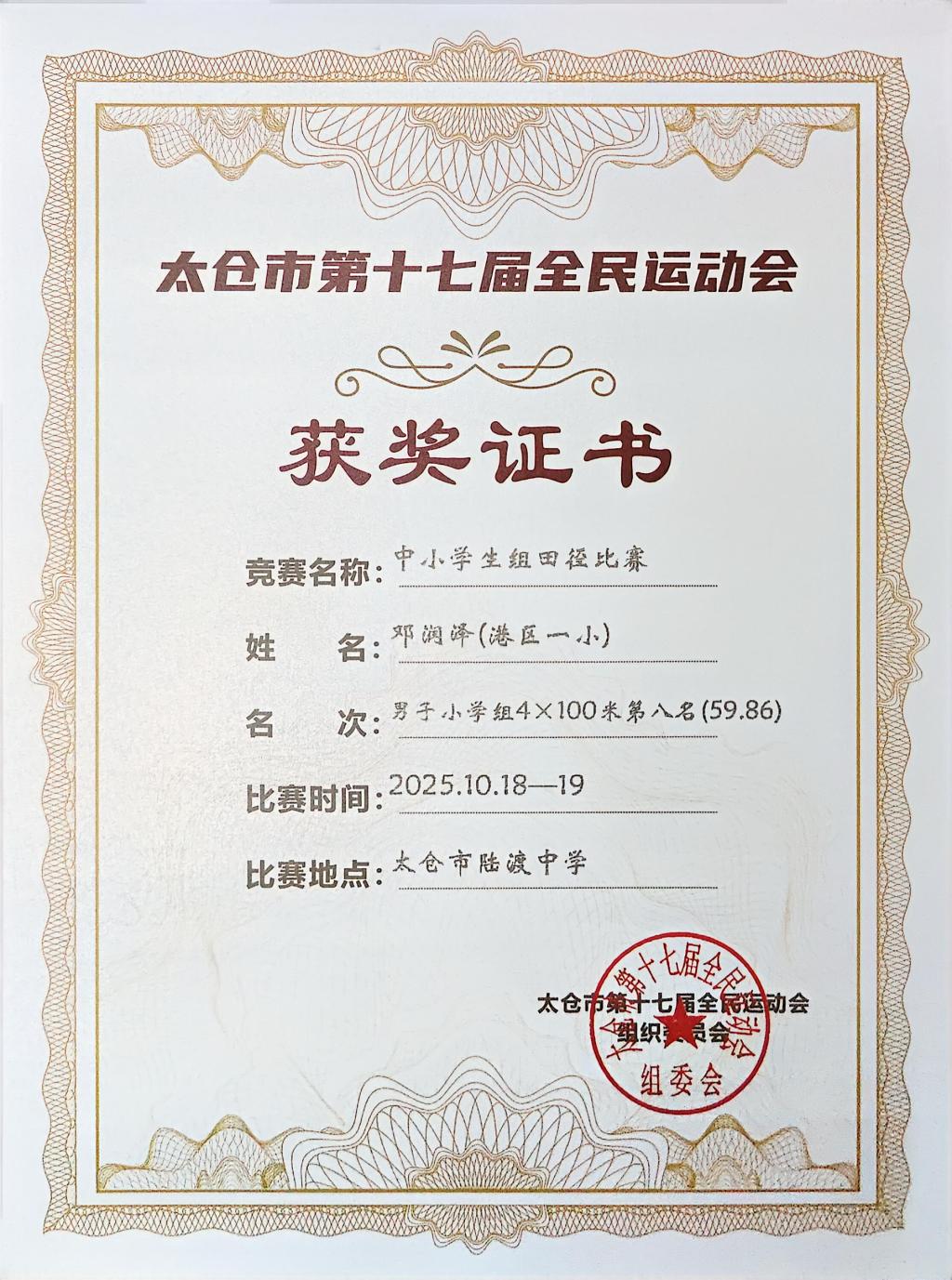 2025.10 邓润泽在太仓市中小学生田径比赛中获小学男子4x100米第八名
