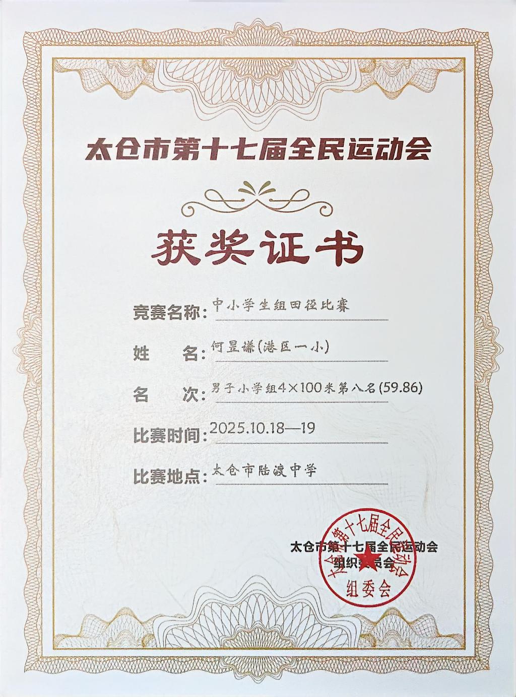2025.10 何昱谦在太仓市中小学生田径比赛中获小学男子4x100米第八名