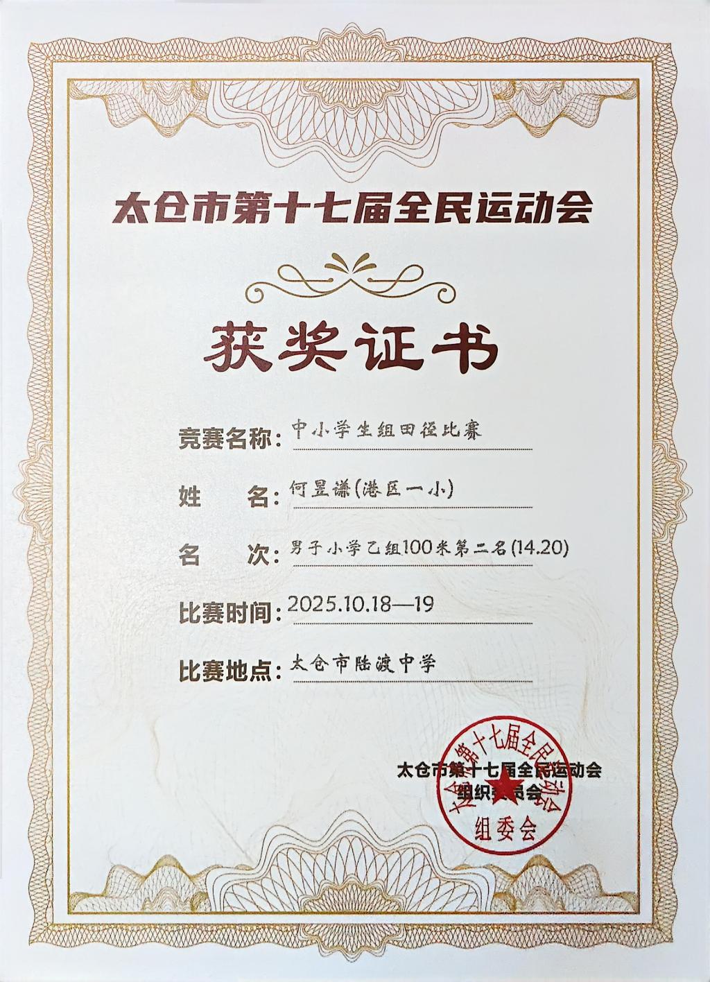 2025.10 何昱谦在太仓市中小学生田径比赛中获小学男子100米第二名