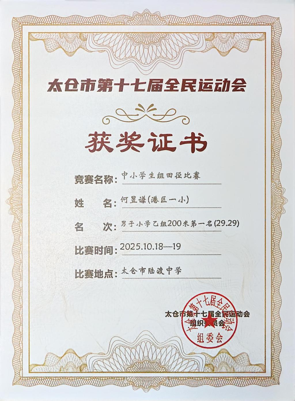 2025.10 何昱谦在太仓市中小学生田径比赛中获小学男子200米第一名