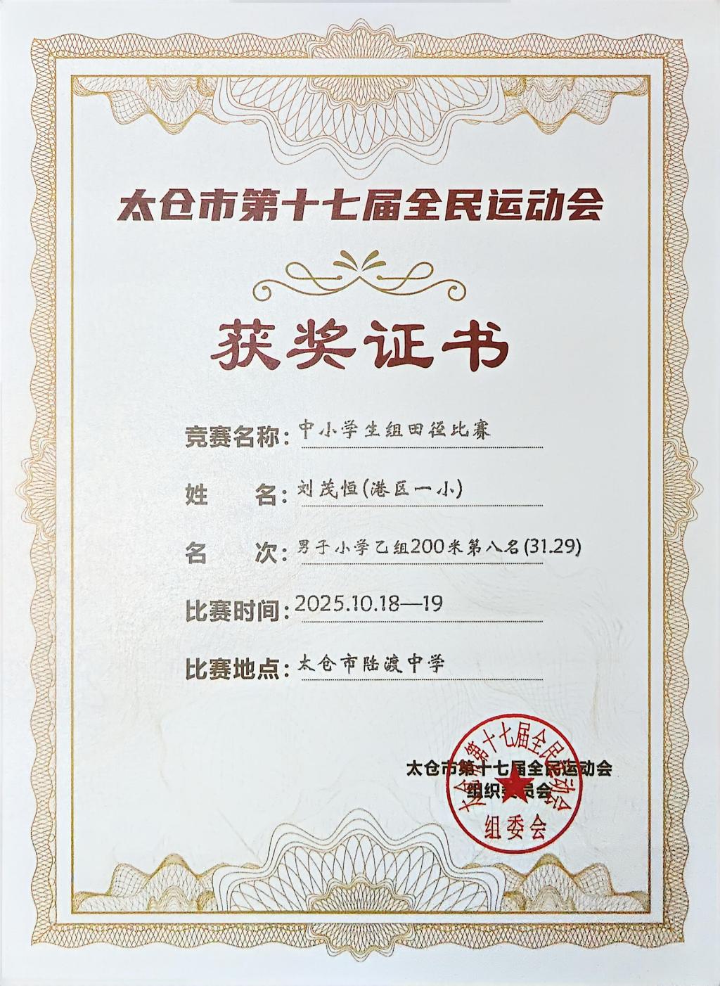 2025.10 刘茂恒在太仓市中小学生田径比赛中获小学男子200米第八名
