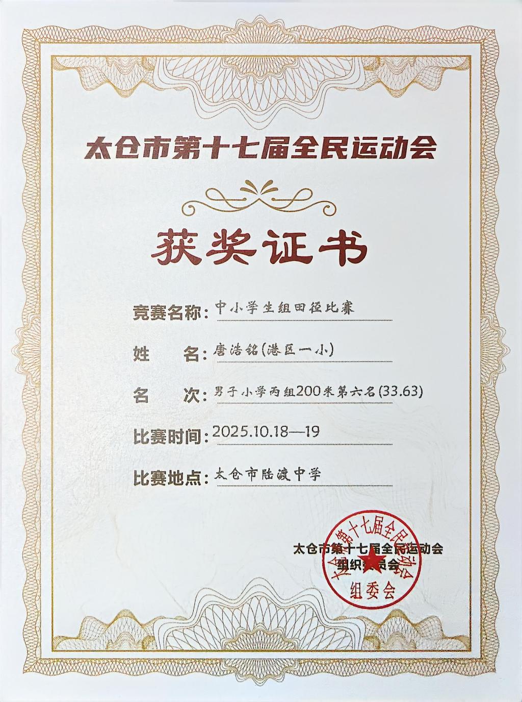 2025.10 唐浩铭在太仓市中小学生田径比赛中获小学男子200米第六名