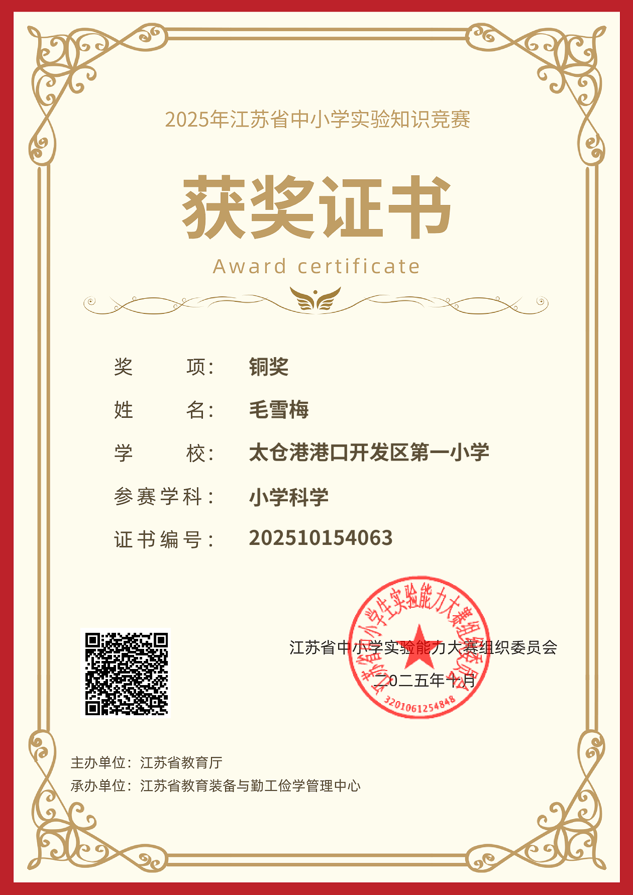 2025.10 毛雪梅在2025年江苏省中小学实验知识竞赛中获铜奖