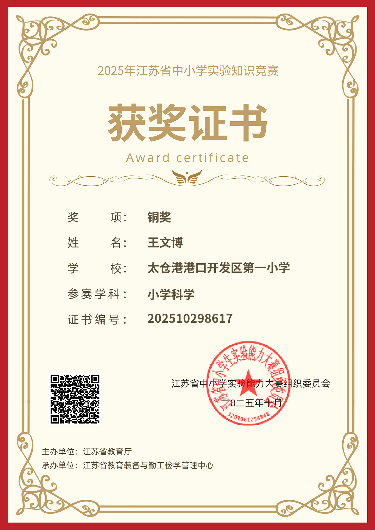 2025.10 王文博在2025年江苏省中小学实验知识竞赛中获铜奖