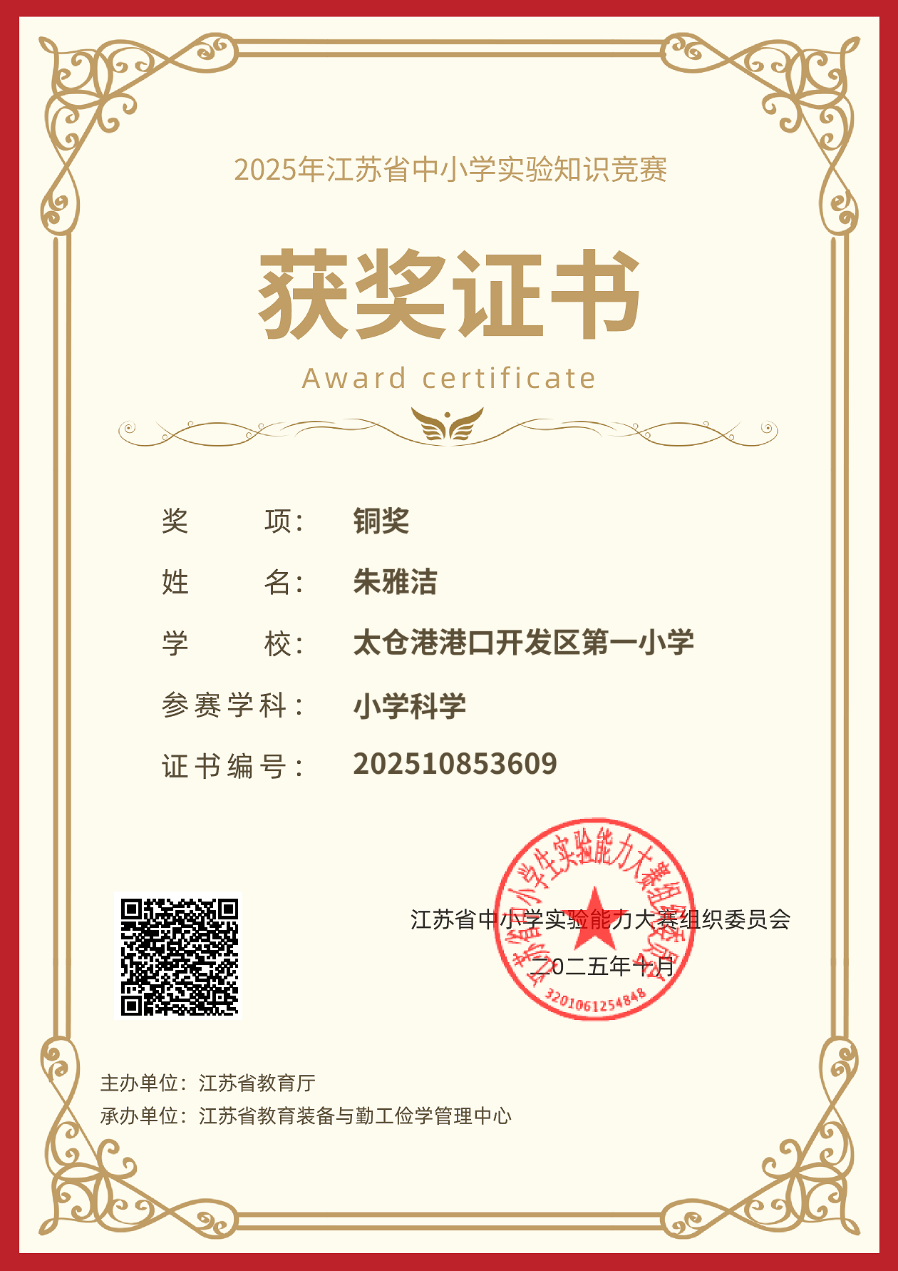 2025.10 朱雅洁在2025年江苏省中小学实验知识竞赛中获铜奖