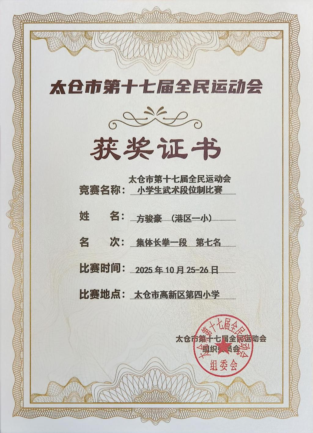 2025.10 方骏豪获太仓市武术段位制比赛集体长拳一段第七名