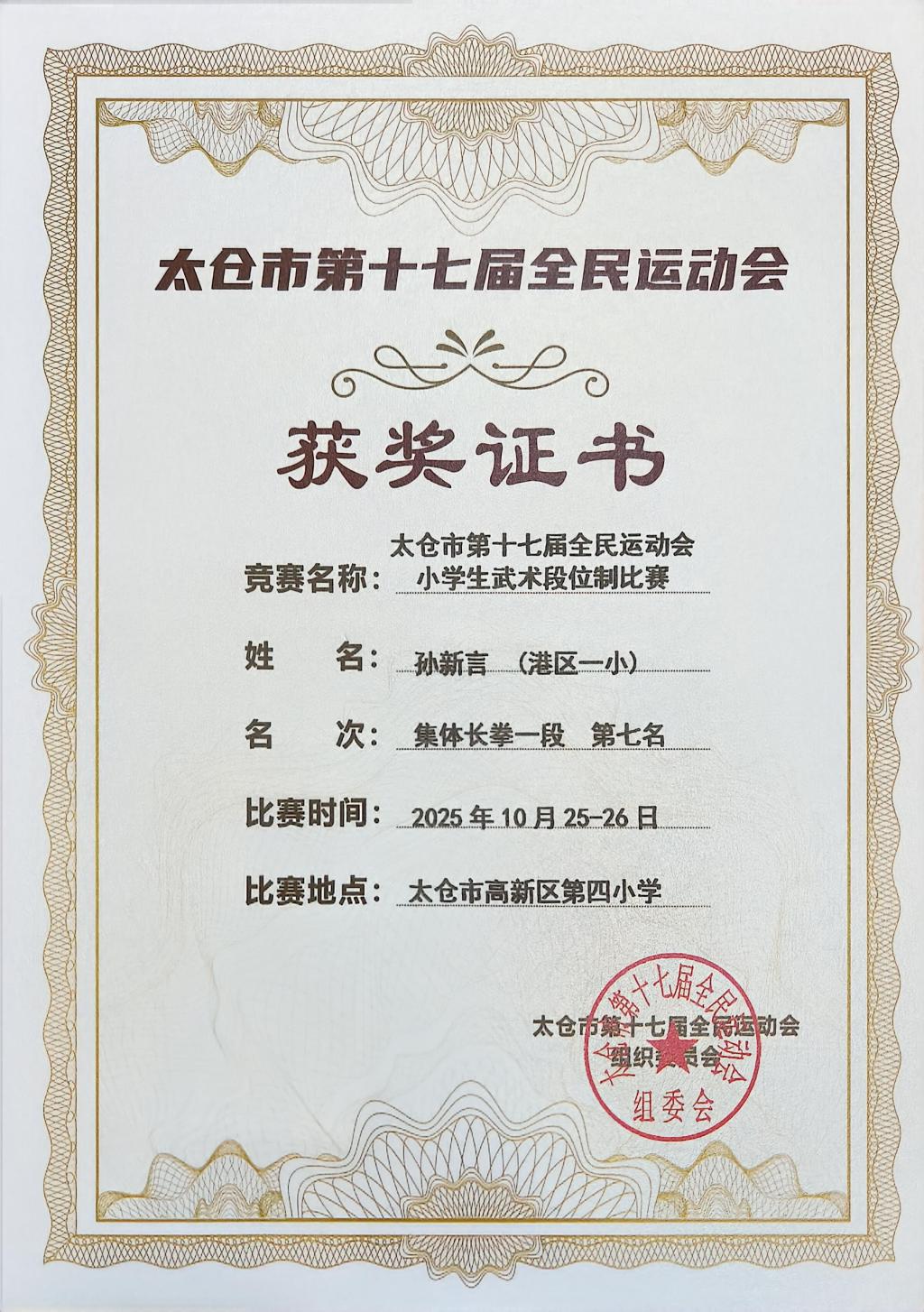 2025.10 孙新宇获太仓市武术段位制比赛集体长拳一段第七名