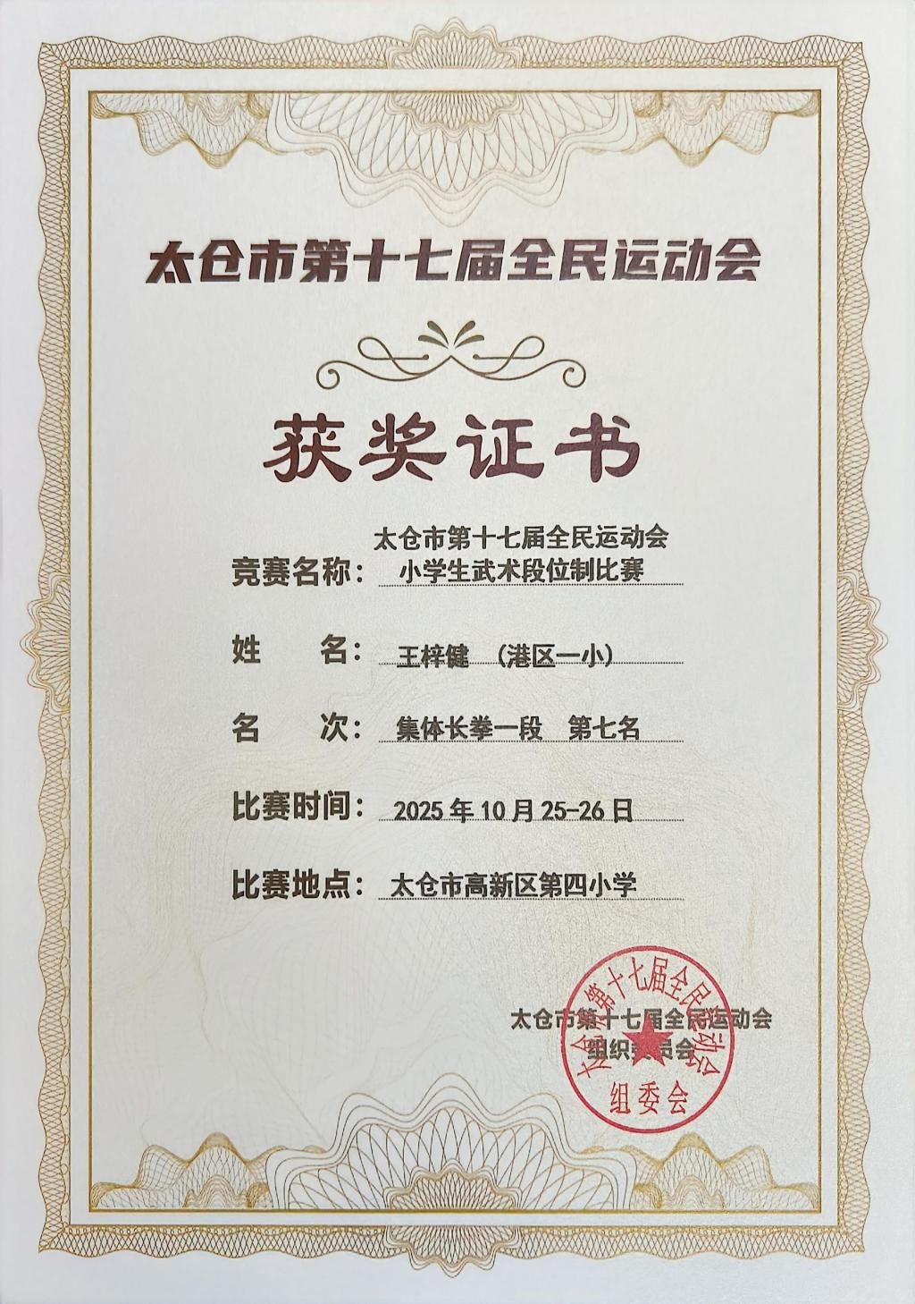 2025.10 王梓健获太仓市武术段位制比赛集体长拳一段第七名