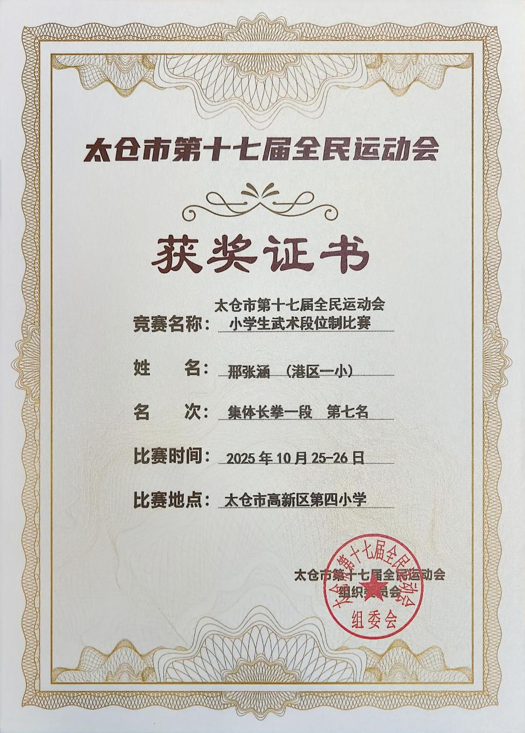 2025.10 邢张涵获太仓市武术段位制比赛集体长拳一段第七名