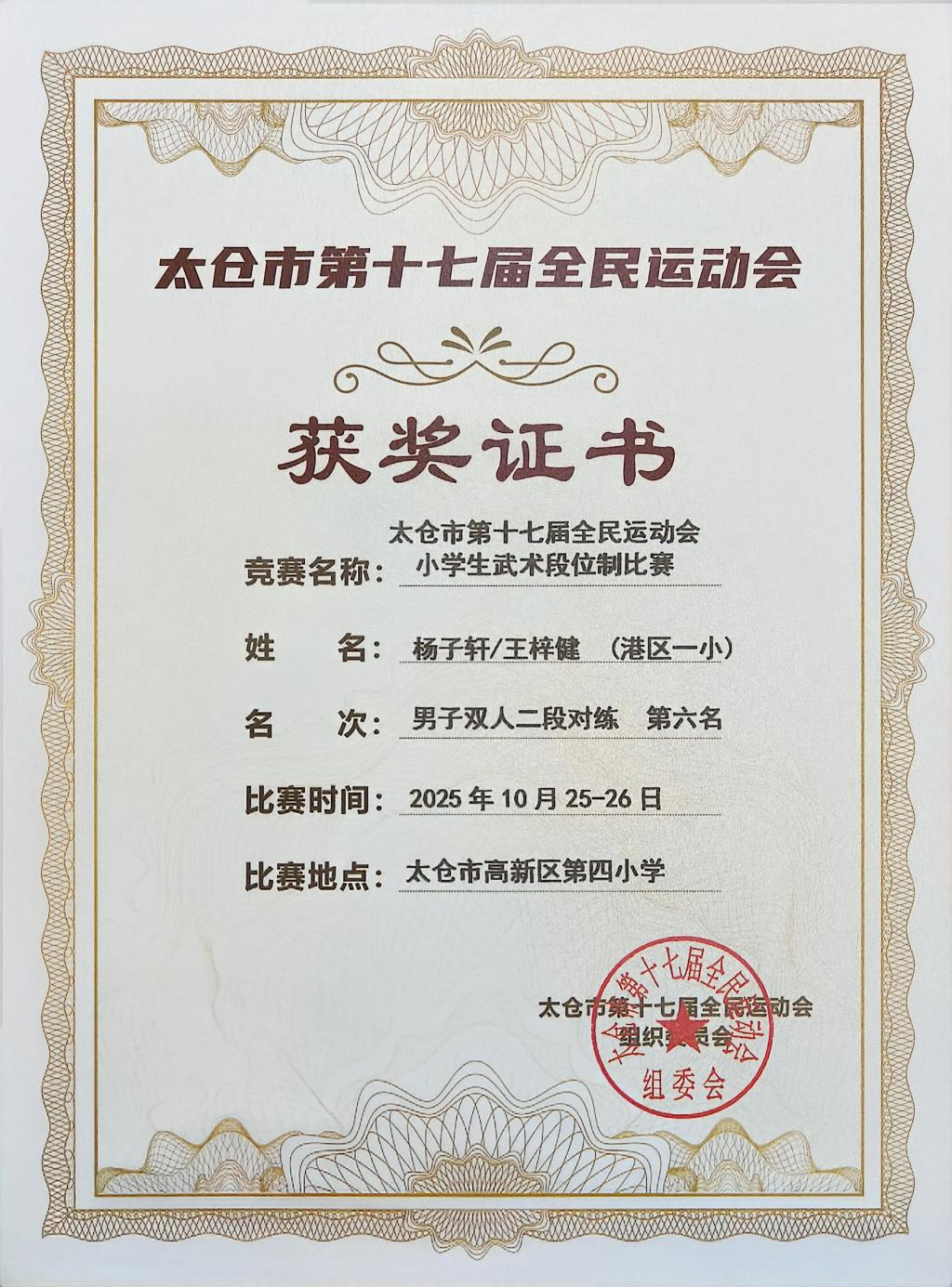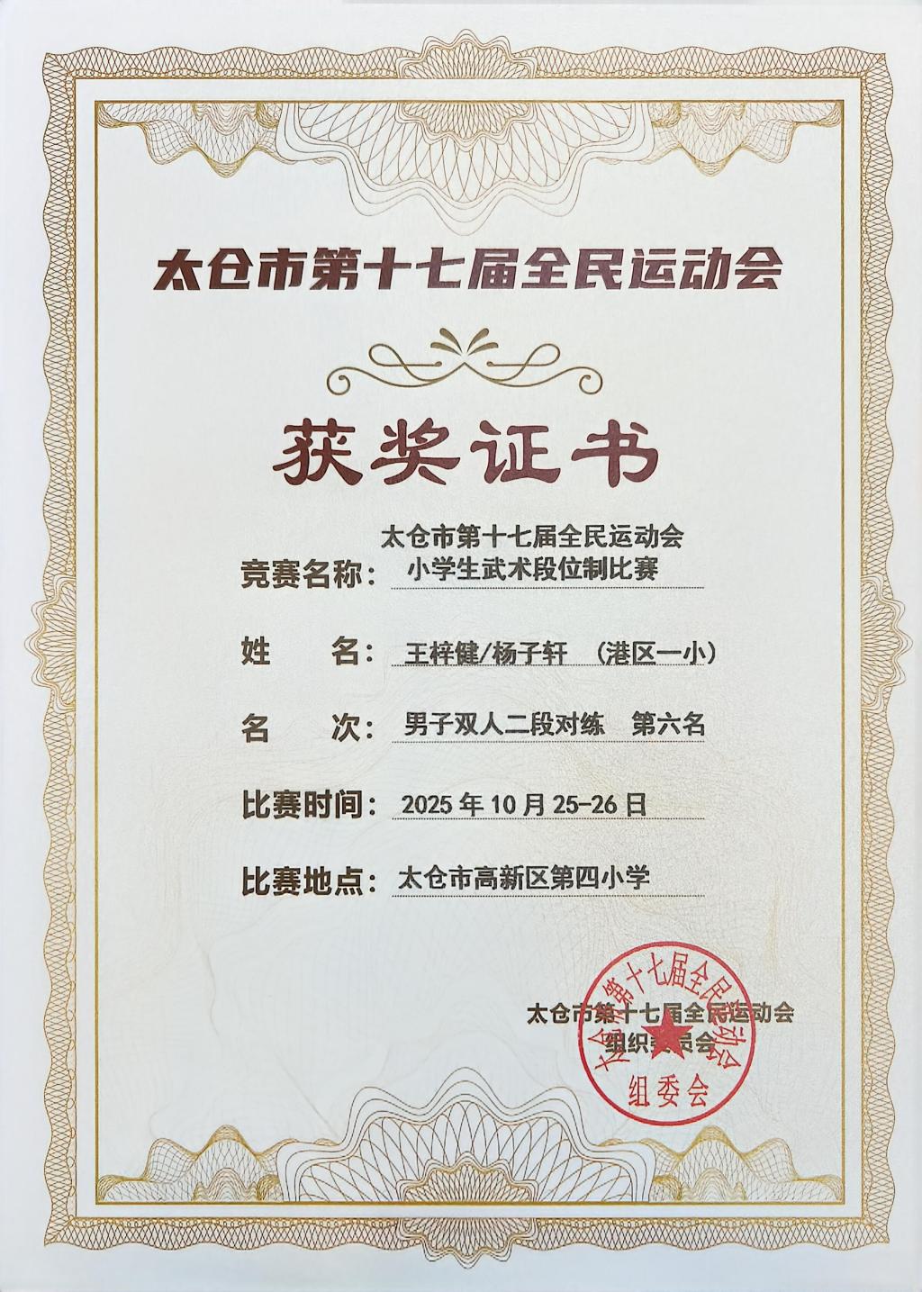 2025.10 杨子轩、王梓能获太仓市武术段位制比赛男子双人二段对练第六名