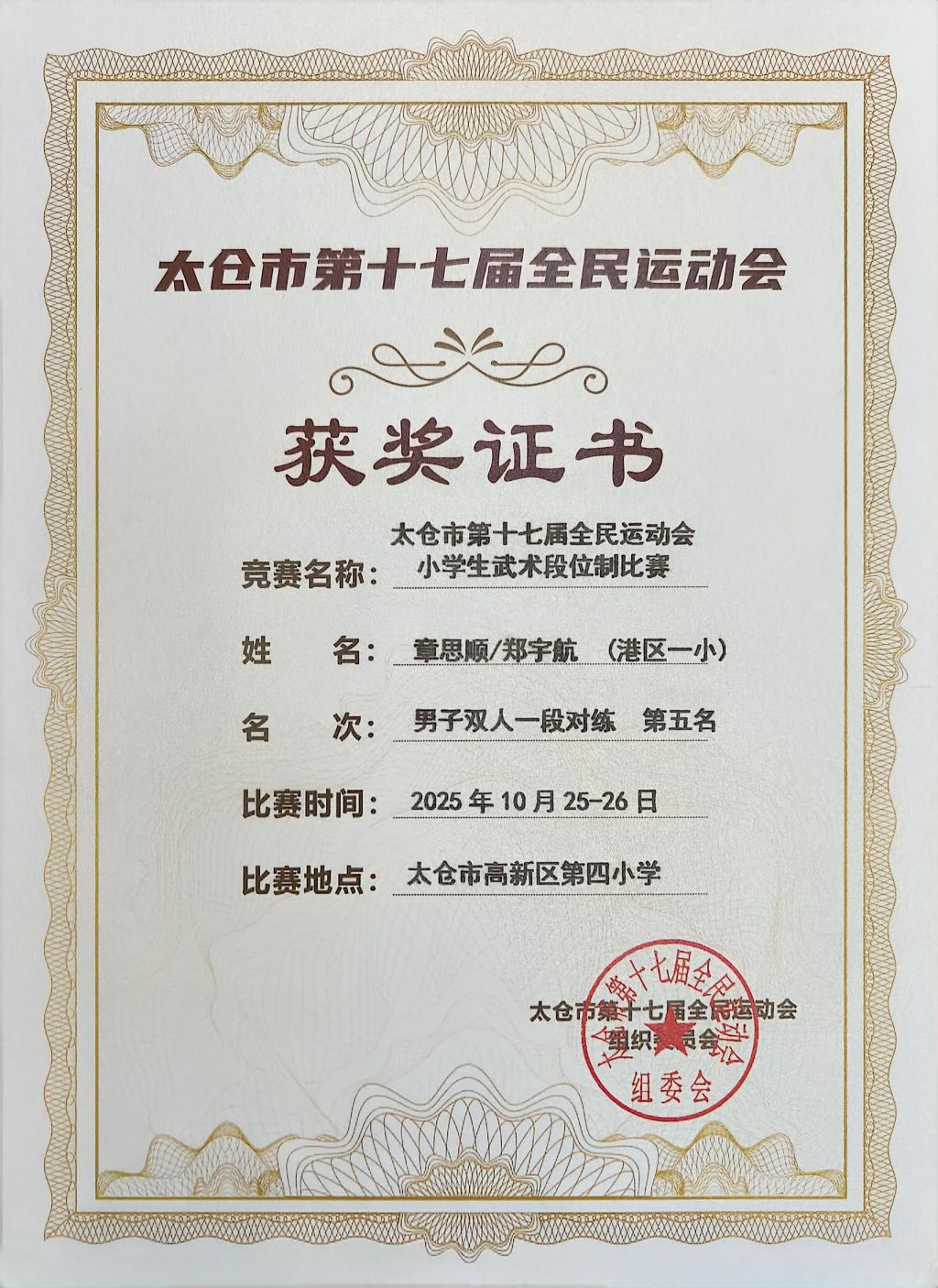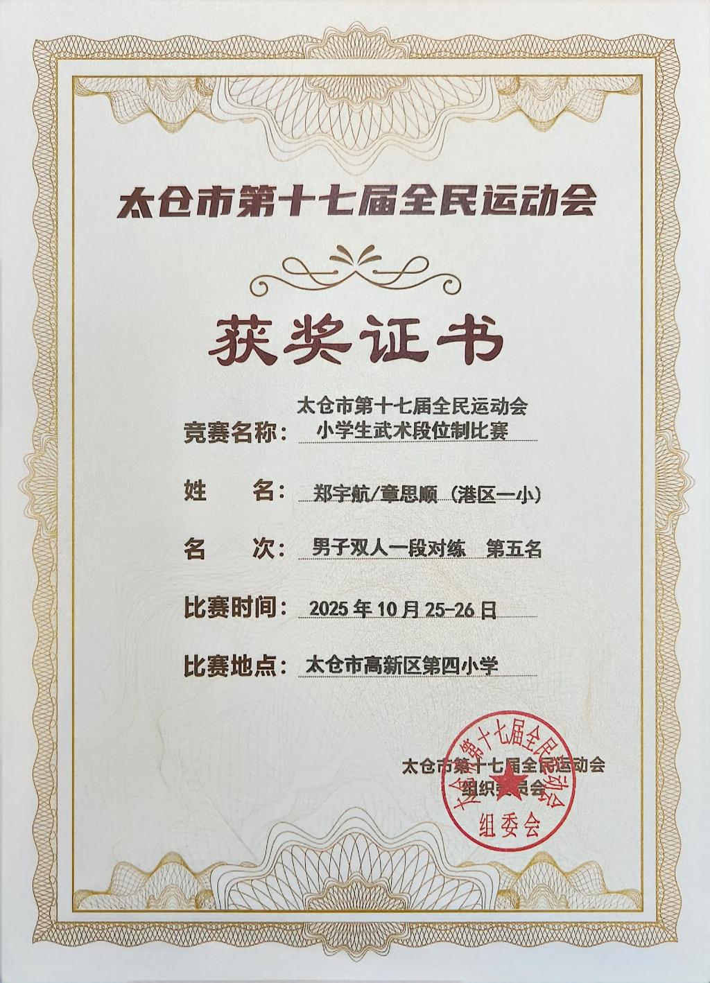 2025.10 章思顺、郑宇航获太仓市武术段位制比赛男子双人一段对练第五名
