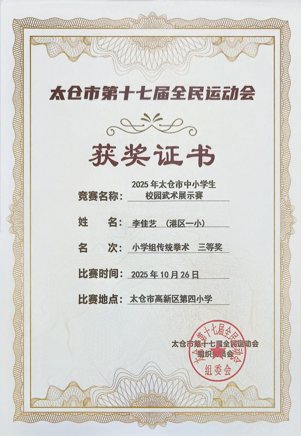 2025.10 李佳艺在2025年太仓市中小学生校园武术展示赛获小学组传统拳术三等奖