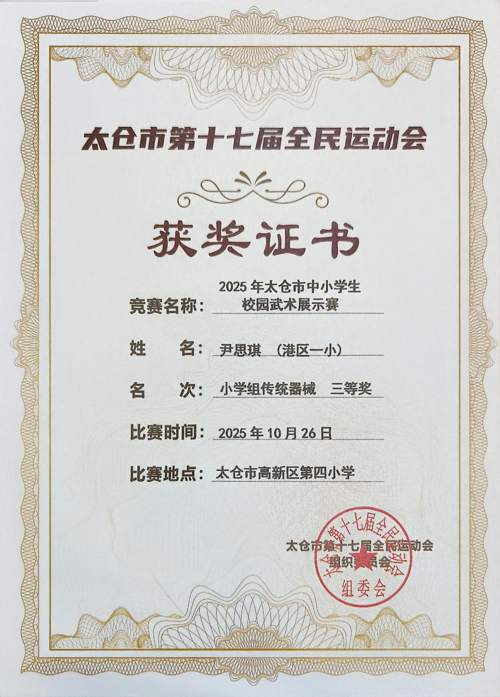 2025.10 尹思琪在2025年太仓市中小学生校园武术展示赛获小学组传统器械三等奖