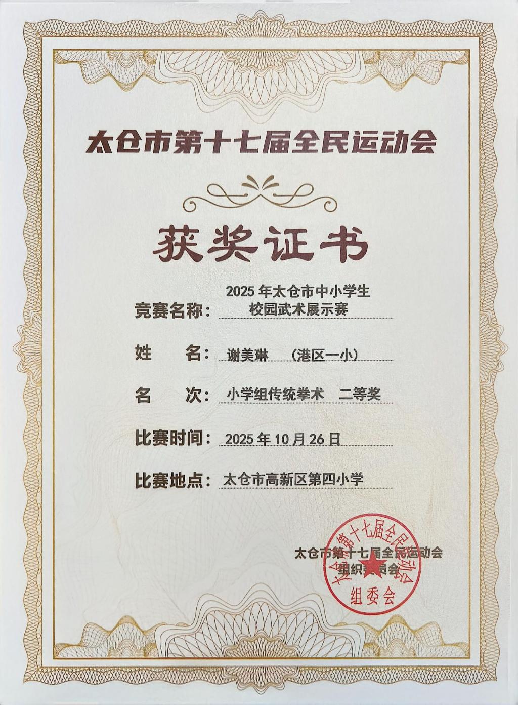 2025.10 谢美琳在2025年太仓市中小学生校园武术展示赛获小学组传统拳术二等奖