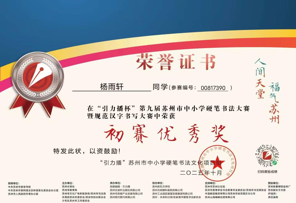 2025.10 杨雨轩在“引力播杯”第九届苏州市中小学硬笔书法大赛中获“初赛优秀奖”(指导教师:谢美玲)