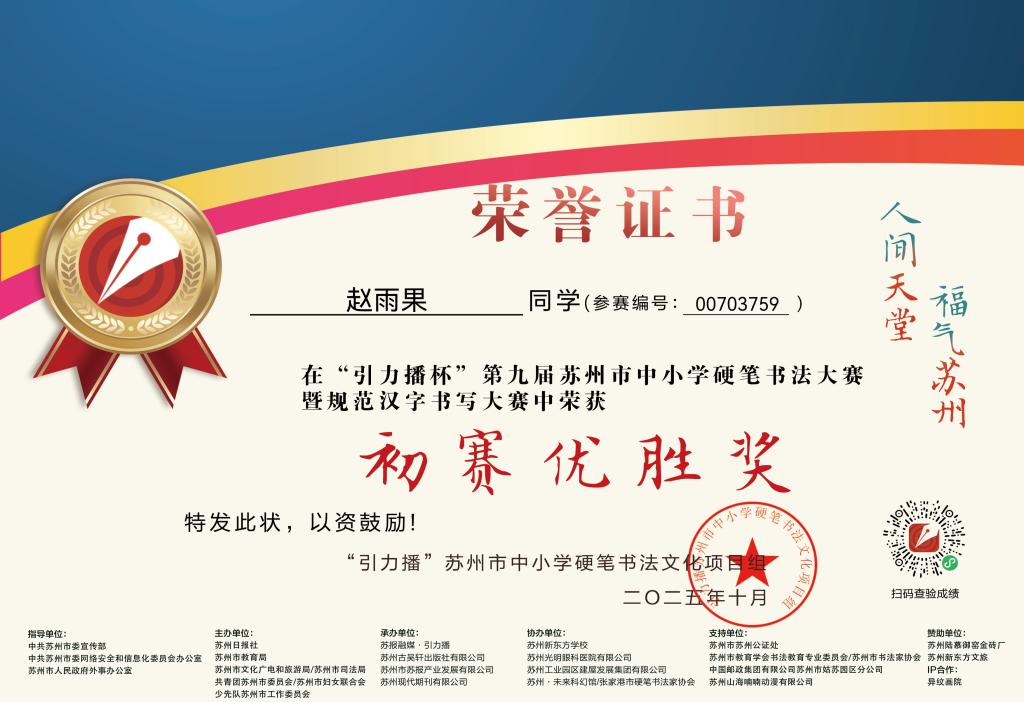 2025.10 赵雨果在“引力播杯”第九届苏州市中小学硬笔书法大赛中获“初赛优胜奖”(指导教师:顾艳)