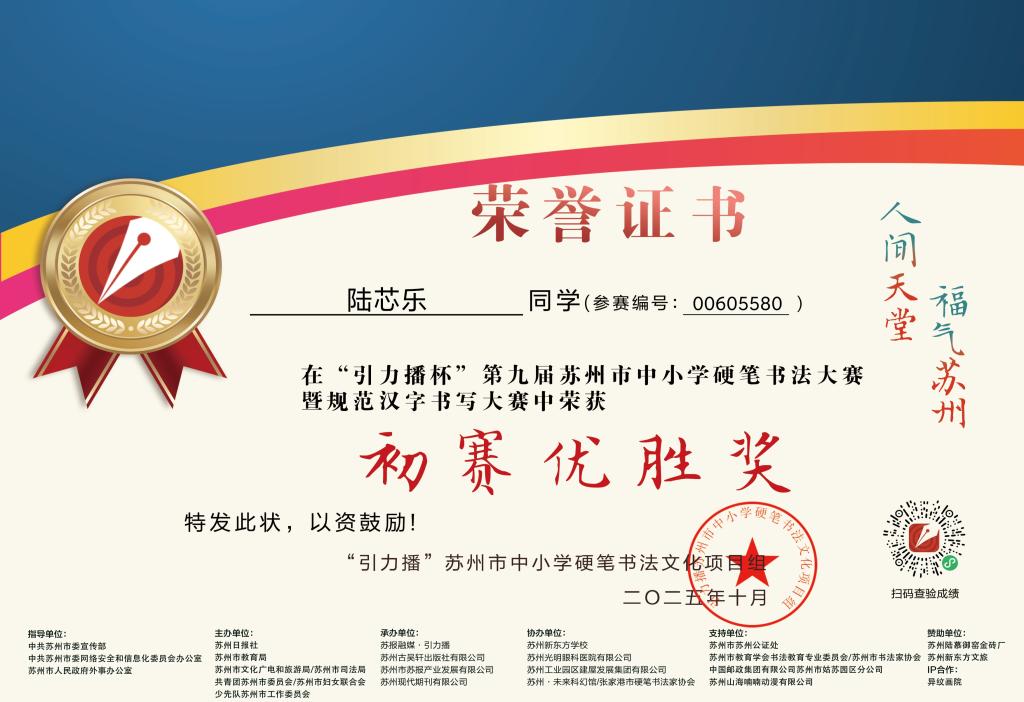 2025.10 陆芯乐在“引力播杯”第九届苏州市中小学硬笔书法大赛中获“初赛优胜奖”(指导老师:金婵)