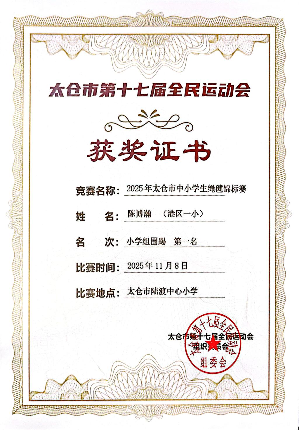 2025.11 陈博瀚获2025太仓市中小学绳毽锦标赛小学组围踢第一名