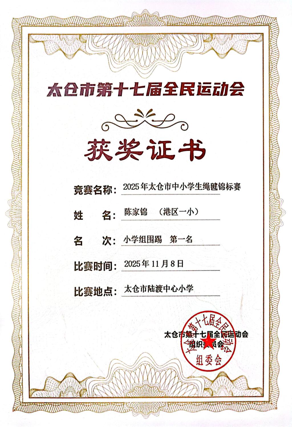 2025.11 陈家锦获2025太仓市中小学绳毽锦标赛小学组围踢第一名